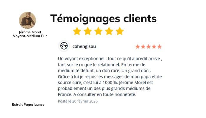 "Un voyant exceptionnel : tout ce qu'il a prédit arrive , tant sur le pro que le relationnel. En terme de médiumnité défunt, un don rare. Un grand don . Grâce à lui je reçois les messages de mon papa et de source sûre, c'est lui à 1000 %. Jérôme Morel est probablement un des plus grands médiums de France. A consulter en toute honnêteté." - Cohengisou - déposé le 21 février 2026 sur PagesJaunes.fr